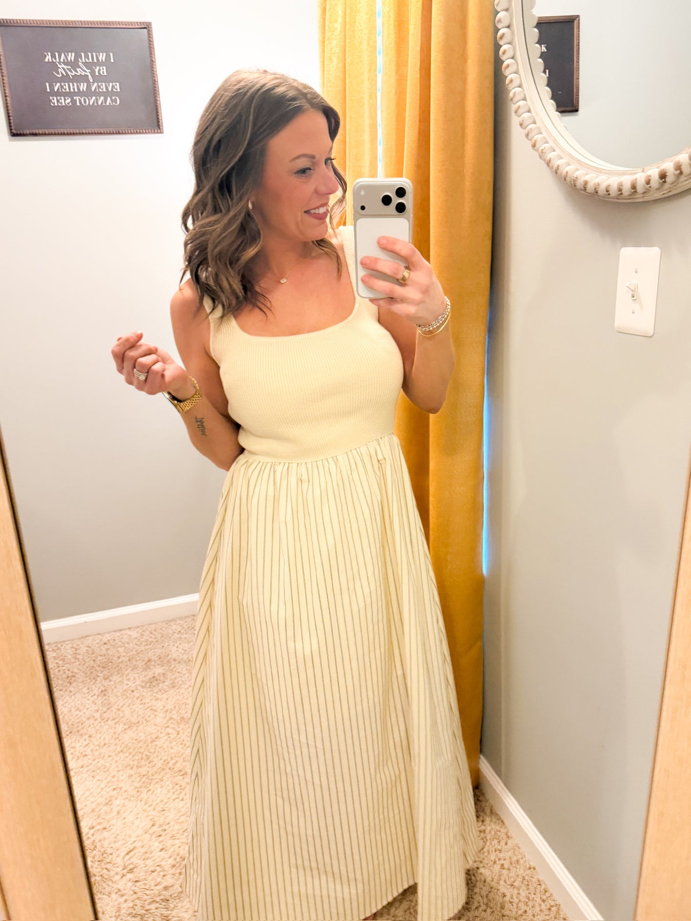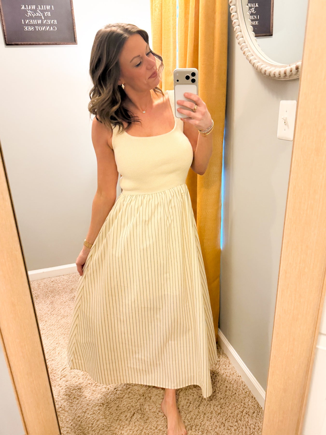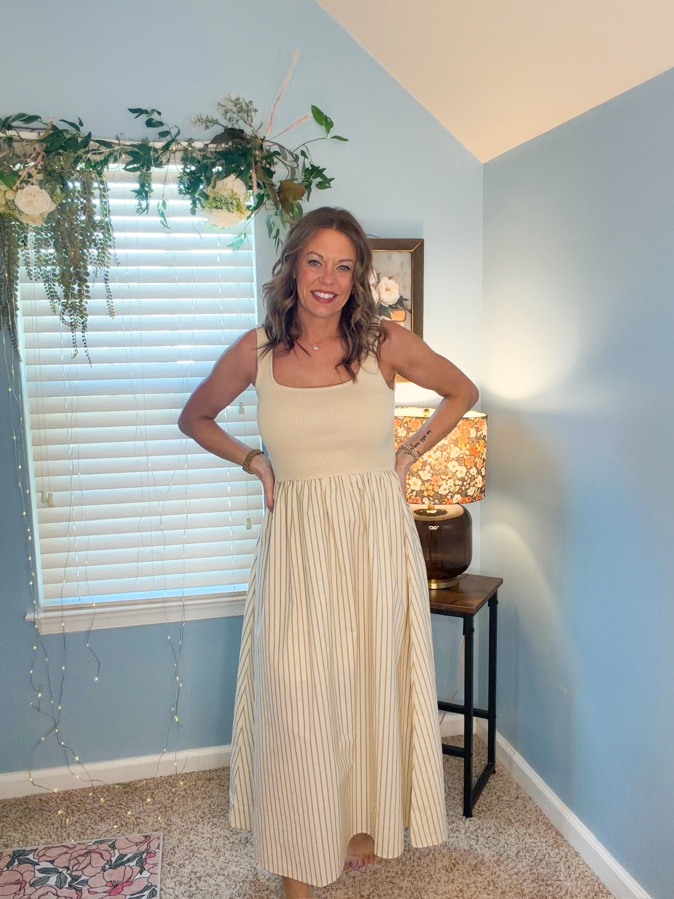 Effortlessly chic, this mixed-media midi dress combines a sleeveless knit tank with a scoop neckline and a striped woven skirt. Perfect for any occasion and perfect for our neutral lovers! Casual but cute and you’re able to dress it up!